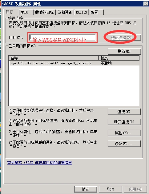 打開ISCSI 配置界面,在目標(biāo)中輸入WSS服務(wù)器的IP地址,然后點(diǎn)擊"快速連接",當(dāng)連接成功后完成后續(xù)配置。